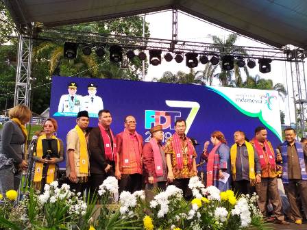 PARAPAT, Eksisnews.com – Kepala Dinas Kebudayaan dan Pariwisata Sumatera Utara dr Ria Novida Telaumbanua didampingi Ketua Komisi B DPRD Sumut Victor Silaen serta Anggota Komisi B lainnya seperti Parsaulian Tambunan, Tuani Lumban Tobing, Zeira Salim Ritonga, Sumihar Sagala serta undangan lainnya menutup secara resmi Festival Danau Toba (FDT) ke-7 Tahun 2019 di Open Stage Parapat, Kamis (12/12/2019).