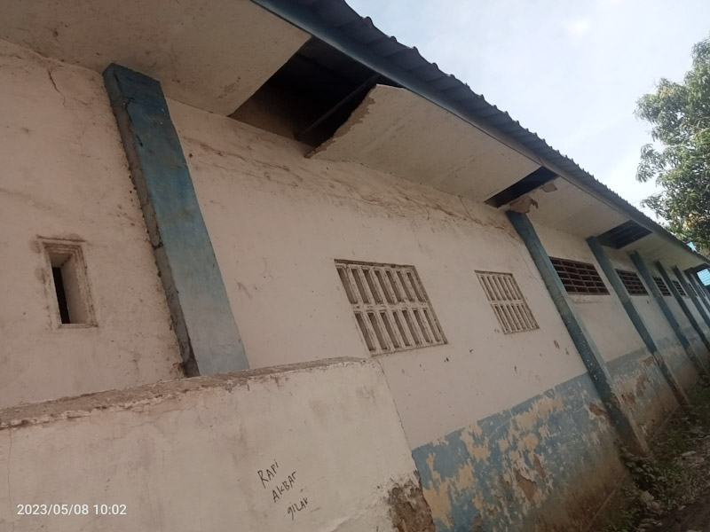 Plafon asbes terlihat berlubang-lubang atau bolong dan jebol dan dinding tembok sekolah tampak kusam (tidak dicat), padahal anggaran Dana BOS yang diterima sekolah tersebut cukup besar.