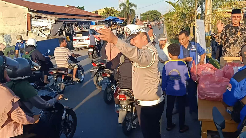 Saat pembagian takjil berlangsung Tim awak media ini dibantu Aipda Mhd Saleh SH untuk menghindari kemacetan.
