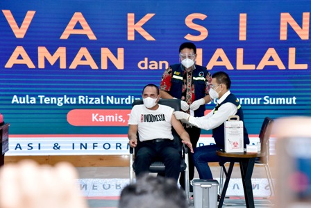 EKSISNEWS.COM, Medan – Gubernur Sumatera Utara (Gubsu) Edy Rahmayadi menerima suntikan vaksin Covid-19 di Aula Tengku Rizal Nurdin, Rumah Dinas Gubernur, Jalan Jenderal Sudirman Nomor 41, Medan, Kamis (14/1/2021). Gubernur adalah orang pertama di Sumut yang disuntikan vaksin Covid-19, sekaligus menandai dimulainya vaksinasi Covid-19 di daerah ini.