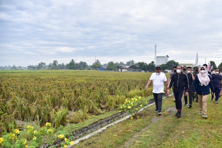Gubernur Sumatera Utara, Edy Rahmayadi bersama Ketua TP PKK Sumut Nawal Lubis meninjau langsung sekaligus panen padi varietas unggul, yang dikembangkan oleh Instalasi Penelitian dan Pengkajian Teknologi Pertanian (IP2TP) Pasar Miring, Balitbangtan BPTP Sumut, Rabu (7/7/2021), di Desa Pasar Miring, Kecamatan Pagar Merbau, Kabupaten Deliserdang.