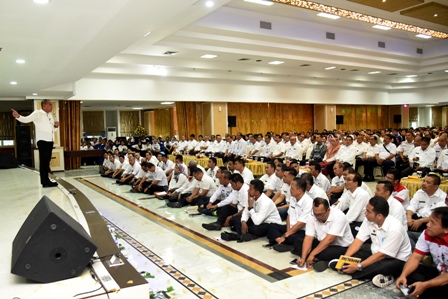 Aula tampak penuh diisi ratusan para pejabat yang antusias mendengarkan arahan dari Gubernur. Meskipun beberapa harus duduk di lesehan di atas lantai, mereka tampak serius menyimak. Sesekali tertawa saat Gubernur menyampaikan lelucon.