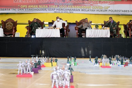 EKSISNEWS.COM, DELISERDANG – Simulasi Tactical Floor Game (TFG) Operasi (Ops) Aman Nusa II Toba 2020 Penanganan Covid-19 Sumatera Utara (Sumut) digelar di Mini GOR Futsal Disporasu, Jalan Williem Iskandar Kabupaten Deliserdang, Rabu (22/4/2020).