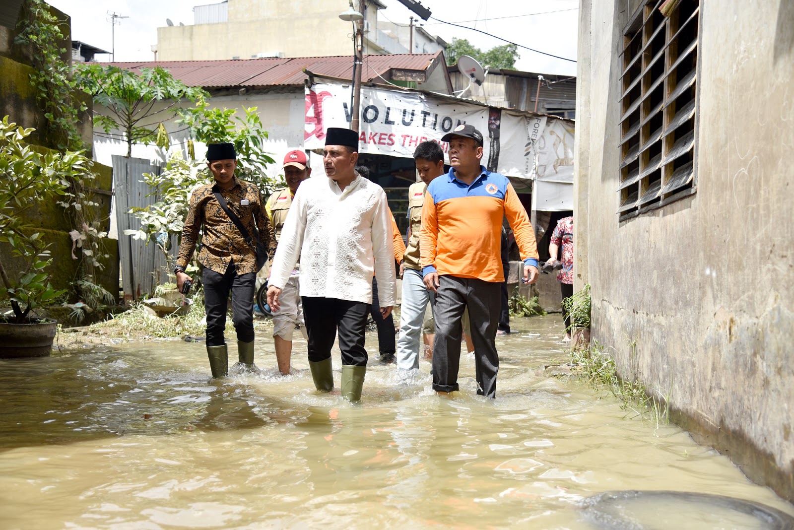 Selanjutnya, peninjauan dilakukan lagi ke Gang Merdeka Jalan Katamso Medan Maimun. Beberapa rumah masih ada yang tergenang air setinggi lutut, sedangkan sisanya sudah mulai mengering dan dibersihkan warga.