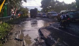 Kondisi jalan provinsi Perdagangan-Siantar yang rusak parah khususnya di kawasan Simpang Kalvin Desa Kerasaan Rejo, Kecamatan Bandar, Kabupaten Simalungun menuju Siantar terlihat seperti kubangan kerbau jika datang hujan.