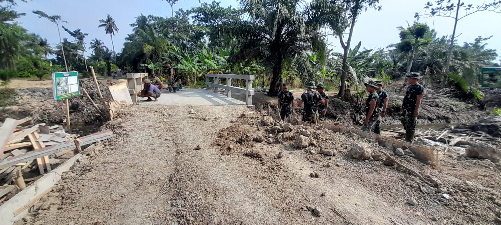 Sejak pagi hingga sore hari, para personel Satgas tiga matra dibantu personel Polri,serta warga bekerja tanpa mengenal lelah. Kondisi cuaca yang tidak menentu tidak menyurutkan tekad mereka untuk terus melanjutkan setiap tahapan pembangunan demi memastikan jembatan dapat segera dimanfaatkan oleh warga petani.