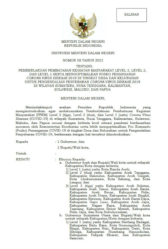 “Alhamdullilah, setelah melalui kajian yang didasarkan pada beberapa indikator, Kabupaten Sergai akhirnya masuk ke Pemberlakuan Pembatasan Kegiatan Masyarakat (PPKM) Level 1, berdasarkan Inmendagri No. 58 Tahun 2021, Tentang Pemberlakuan Pembatasan Kegiatan Masyarakat Level 3, Level 2, dan Level 1 Serta Mengoptimalkan Posko Penanganan Corona Virus Disease 2019 di Tingkat Desa dan Kelurahan untuk Pengendalian Penyebaran Corona Virus Disease 2019 di Wilayah Sumatera, Nusa Tenggara, Kalimantan, Sulawesi, Maluku, dan Papua,” buka Jubir Satgas.