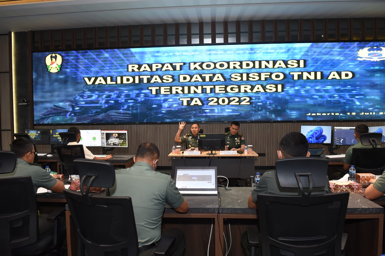 EKSISNEWS.COM, Jakarta – Kepala Dinas Informasi dan Pengolahan Data (Kadisinfohlahta) TNI AD Brigjen TNI Fitry Taufiq Sahary, S.E., M.M., memimpin Rapat Koordinasi (Rakor) Validitas/Pemutakhiran Data Sisfo TNI AD Terintergrasi TA. 2022 di Gedung Security Operation Center (SOC) Lantai III Mabesad, Jakarta Pusat. Rabu, (13/7/2022).