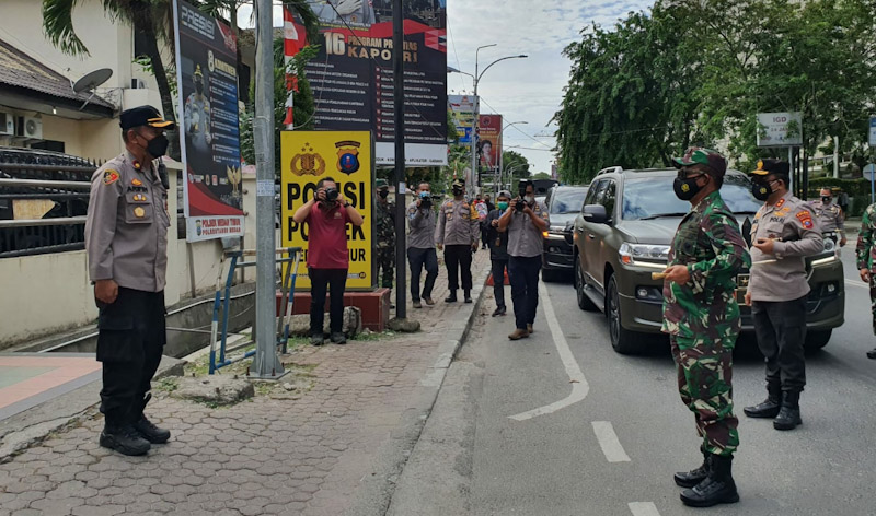 EKSISNEWS.COM, Medan – Sebagai bentuk kepedulian, Kapolda Sumatera Utara Irjen Pol Panca Putra dan Pangdam I/BB Mayjen TNI Hasanuddin, memberikan bingkisan berupa makanan dan minuman kepada personil gabungan yang bertugas menjalankan PPKM darurat di Mapolsek Medan Timur, Senin (19/7/2021).