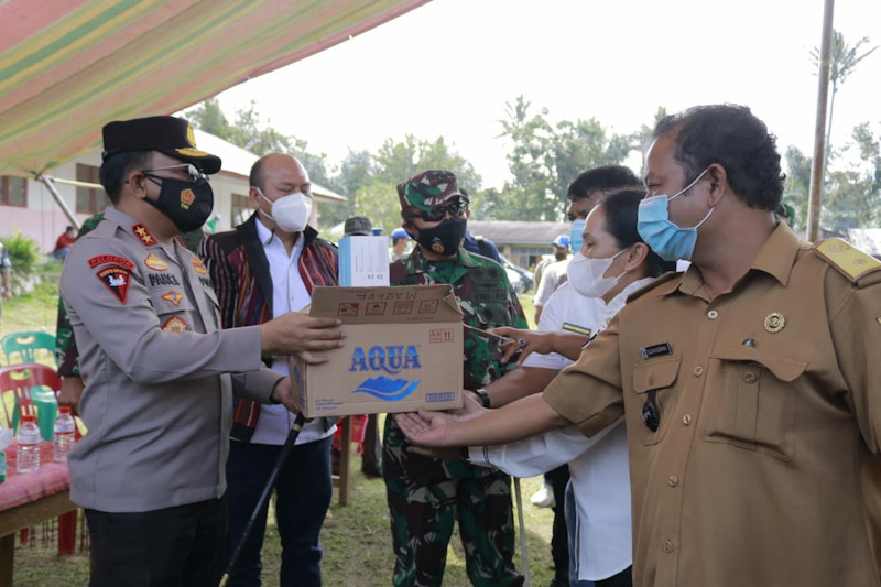 Kapolda Sumut dan Pangdam I/BB dalam kunjungannya memberikan bantuan berupa masker dan perlengkapan kesehatan lainnya kepada masyarakat Kecamatan Dusun Huta Gurgur Desa Aek Tangga Kecamatan Garoga Kabupaten Tapanuli Utara.