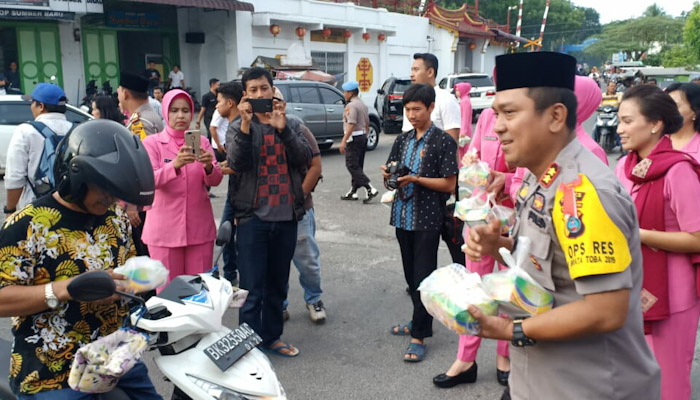 Satu per satu takjil untuk berbuka puasa dibagikan oleh Kapolres Asahan dan Ketua Bhayangkari Cabang Asahan kepada warga yang melintas. Sejumlah Pejabat Utama Polres Asahan dan para pengurus Bhayangkari Cabang Asahan juga terlihat membagi-bagikan takjil kepada masyarakat.