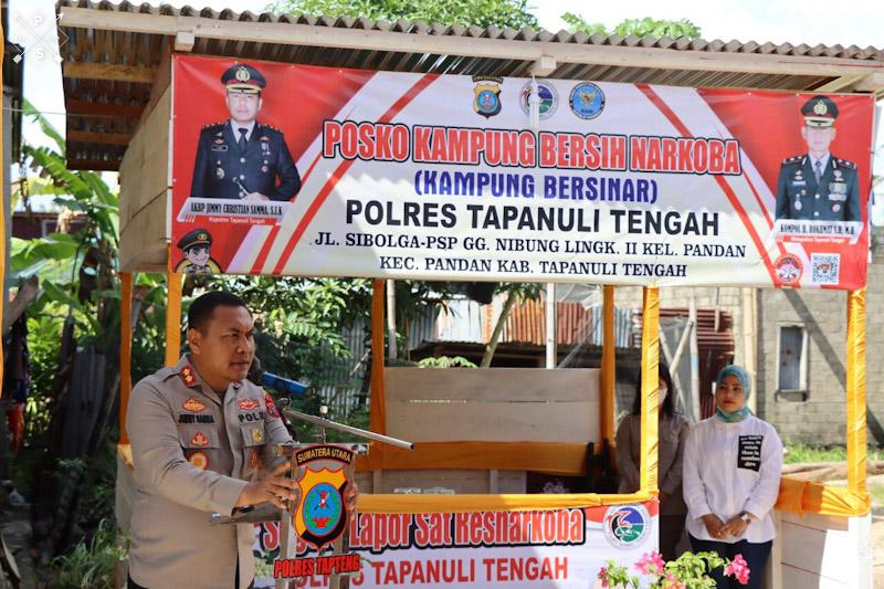 EKSISNEWS.COM, Tapteng – Kapolres Tapanuli Tengah (Tapteng), AKBP Jimmy Christian Samma didampingi Kasat Resnarkoba, AKP Juli Purwono meresmikan Posko Kampung Bersih Narkoba (Kampung Bersinar) di Gang Nibung, Lingkungan II, Kelurahan Pandan, Kecamatan Pandan, Kabupaten Tapteng, Selasa (21/6/2022) siang.