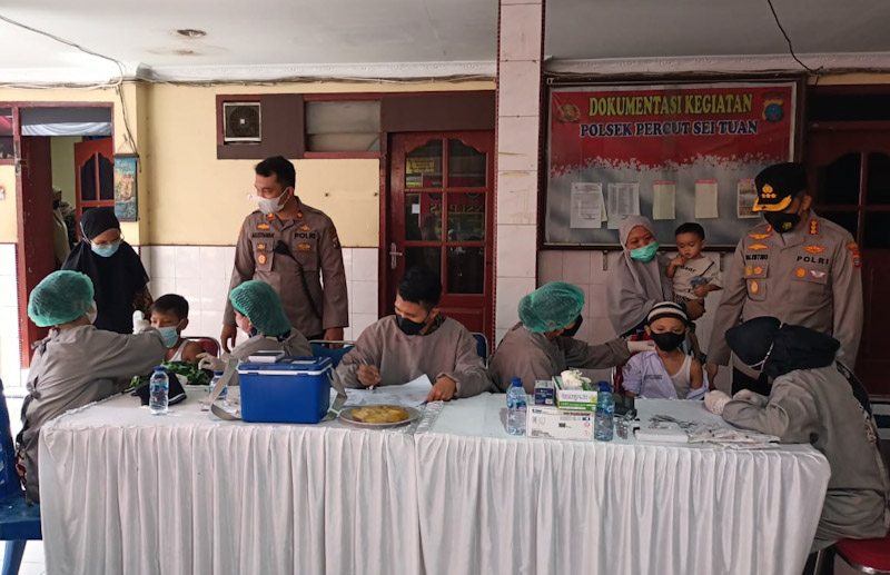 EKSISNEWS.COM, Medan – Percepatan vaksinasi, Polsek Percut Sei Tuan bekerjasama dengan Tim Nakes RS Citra Medika gelar vaksinasi untuk umum dan anak usia 6-12 tahun dengan dosis 1,2 dan 3 (Boster) di Mako Polsek Percut Sei Tuan, Jalan Letda Sujono, Medan Tembung, Jumat (22/2/2022).