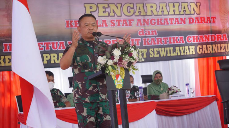 EKSISNEWS.COM, Padang – Pangdam I/BB Mayjen TNI Achmad Daniel Chardin, SE, MSi, mendampingi Kepala Staf Angkatan Darat (Kasad) Jenderal TNI Dudung Abdurachman, S.E., M.M., bersama ketua umum Persit Kartika Chandra Kirana, Ny Rahma Dudung Abdurachman dalam memberikan pengarahan kepada Prajurit Yonif 133/YS dan Persit di Kota Padang, Sumbar, Rabu (9/3/2022)