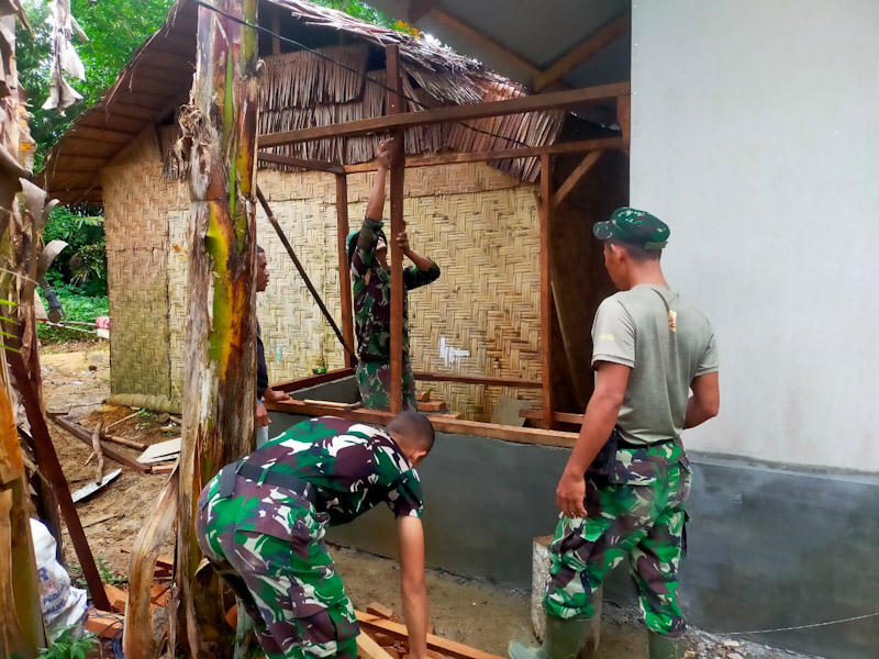 Untuk pekerjaan rehab Rumah Tidak Layak Huni (RTLH) milik Bapak Dedi,saat ini personel Satgas melanjutkan pembuatan dapur rumah dan hasilnya 60 %.