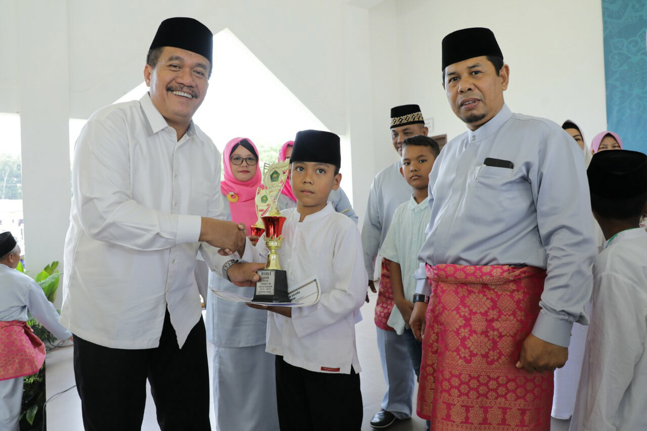 Pada kesempatan ini Sekretaris Daerah Kabupaten Asahan memberikan hadiah kepada siswa madrasah pemenang perlombaan.(ENC-Akm)