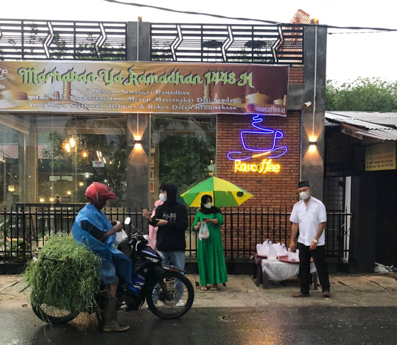 Pembagian takjil ini dipimpin langsung owner RowCoffee H. Syahrul Aman Siregar didampingi isteri Hj. Tengku Nurdiana dan Barista (Eci dan Ganang) serta Waiters (Sofian Hidayat).