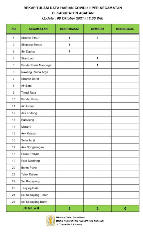EKSISNEWS.COM, Asahan – Rekapitulasi Harian Covid – 19 per Kecamatan untuk hari ini sebagaimana data surveilans dari seluruh Puskesmas di wilayah Kabupaten Asahan yang di kelola Dinas Kesehatan Kabupaten Asahan pertanggal 08 Oktober 2021 hingga pukul 12.00 Wib, kembali ada 3 orang warga di Asahan yang terkonfirmasi positif, 5 orang telah dinyatakan sembuh dan tidak ada yang meninggal dunia.
