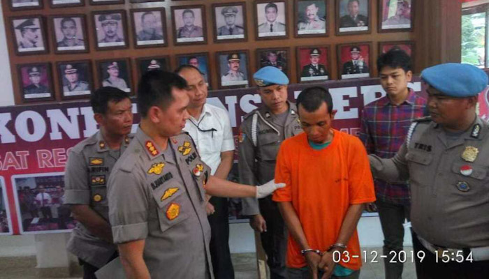 “Saya menyesal Pak dan meminta maaf atas perbuatan yang telah aku lakukan,” ucap pelaku dengan nada suara pelan dihadapan wartawan sembari digiring kembali oleh petugas ke dalam sel usai kegiatan Konferensi Pers yang berlangsung di dalam Loby utama Polrestabes Medan. (ENC- Bucos)