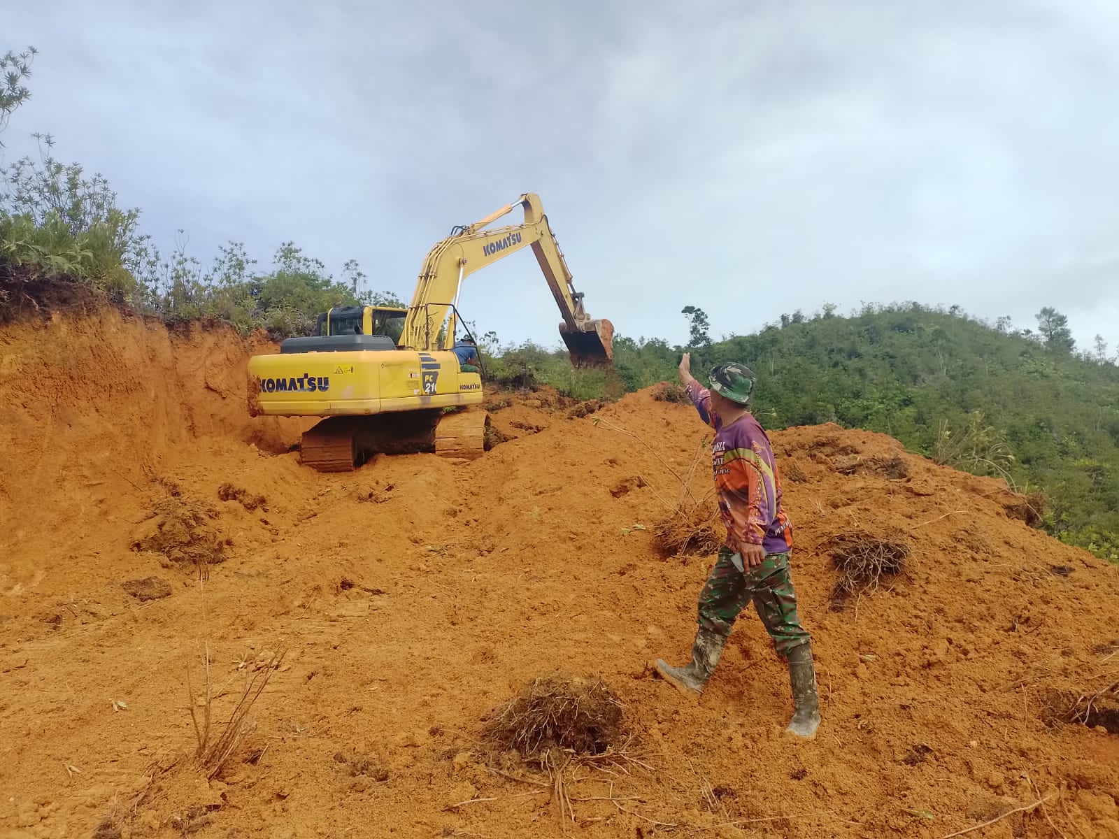 Semangat luar biasa, Satgas TMMD yang terdiri dari prajurit TNI dan masyarakat, terus melaksanakan pengerjaan pembukaan jalan dengan menurunkan alat berat hingga penggunaan cangkul untuk meratakan tanah.