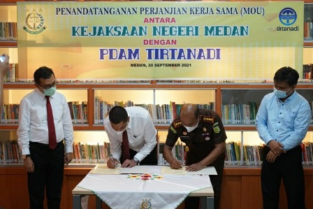 Penandatanganan Perjanjian Kerjasama tersebut berlangsung di Kantor Kejari Medan, Kamis (30/9/2021), antara Kepala Kejaksaan Negeri (Kajari) Medan Teuku Rahmatsyah  dan Direktur Utama PDAM Tirtanadi Provinsi Sumut, Kabir Bedi.