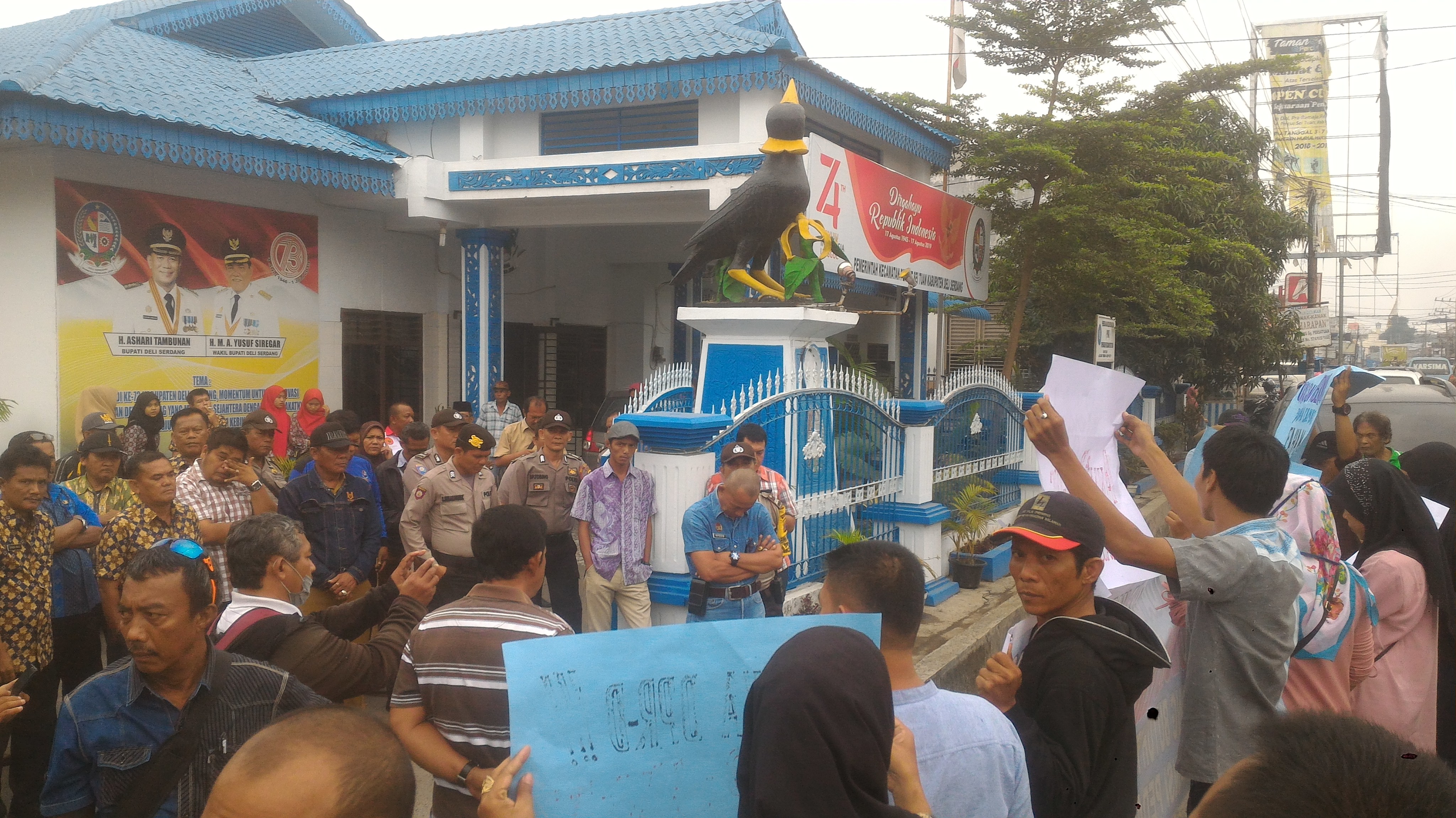 Dari pantauan terlihat, para pedagang degan membentangkan poster-poster yang bertuliskan kritikan terhadap sikap Camat Percut Sei Tuan yang dinilai argan terhadap para pedagang berdiri didepan pintu gerbang kantor Camat Percut Sei Tuan.