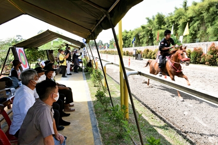 Edy Rahmayadi melihat dari dekat bagaimana kompetisi horseback archery berlangsung. Walau sedikit berdebu, dia berkali-kali memberikan tepuk tangan untuk rider (penunggang kuda) yang berhasil melesatkan anak panahnya ke sasaran.