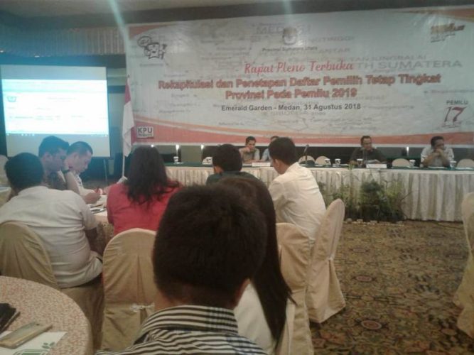 Rapat pleno dibuka Ketua KPU Sumut Mulia Banurea, dihadiri KPU Kabupaten/kota se Se-Sumut, partai Politik, komisioner KPU Yulhasni, Iskandar Zulkarnain ,Nazir Salim Manik, Ketua Bawaslu Sumut Syafrida Raihan Rasahan serta Bawaslu Medan Fadli.