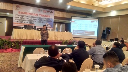 Hadir dalam kegiatan Bimtek, Ketua KPU Kota Medan, Agussyah Damanik,dan anggota KPU Medan seperti M Rinaldi Khair, dan Edy Suhartono sekaligus memberi materi kepada peserta yang hadir.(ENC-2)
