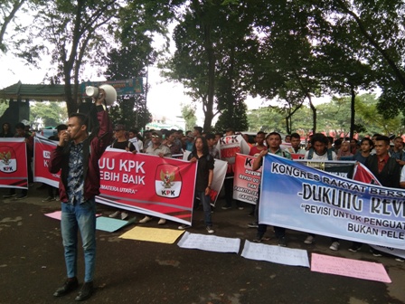 “Hari ini, kami tolak kelompok tertentu yang tidak mendukung revisi UU KPK,” kata pimpinan aksi Edwin s Sihombing dihadapan para aksi massa.