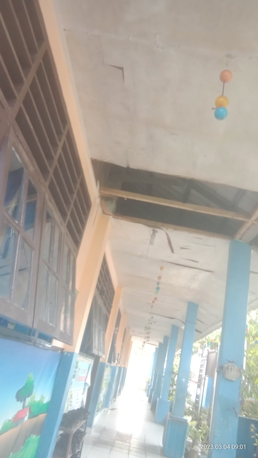 Terlihat beberapa plafon asbes gedung sekolah tampak berlubang ( bolong ), dan pagar dinding sekolah juga terlihat seperti tidak ada pengecatan.