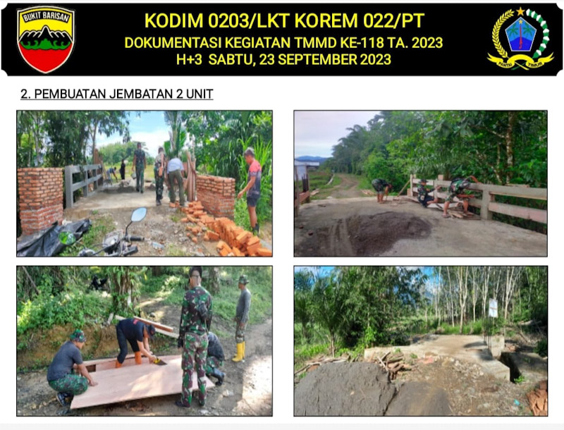 Sedangkan untuk pembuatan 2 unit jembatan sepanjang 6 m x 5 m Desa Timbang Lawan Kec. Bahorok Kab. Langkat,untuk Jembatan 1 capai 80 % dan Jembatan 2 capai 78 %,total persentase jembatan 79 %.