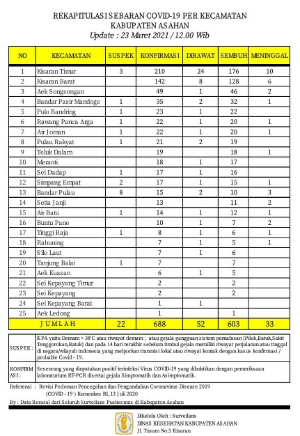 Dari 688 warga Asahan yang Konfirmasi ada sebanyak 52 orang dalam perawatan, 603 orang telah dinyatakan sembuh serta 33 orang meninggal dunia dan ada 22 orang yang dinyatakan Suspek.