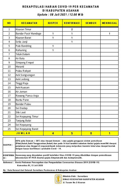 EKSISNEWS.COM, Kisaran – Rekapitulasi Harian Covid – 19 per Kecamatan untuk hari ini sebagaimana data surveilans dari seluruh Puskesmas yang ada di wilayah Kabupaten Asahan yang di kelola Dinas Kesehatan Kabupaten Asahan tanggal 08 Juli 2021 pukul 12.00 Wib ada 4 warga Asahan Suspek, 5 Konfirmasi dan 1 Meninggal akibat Covid – 19.