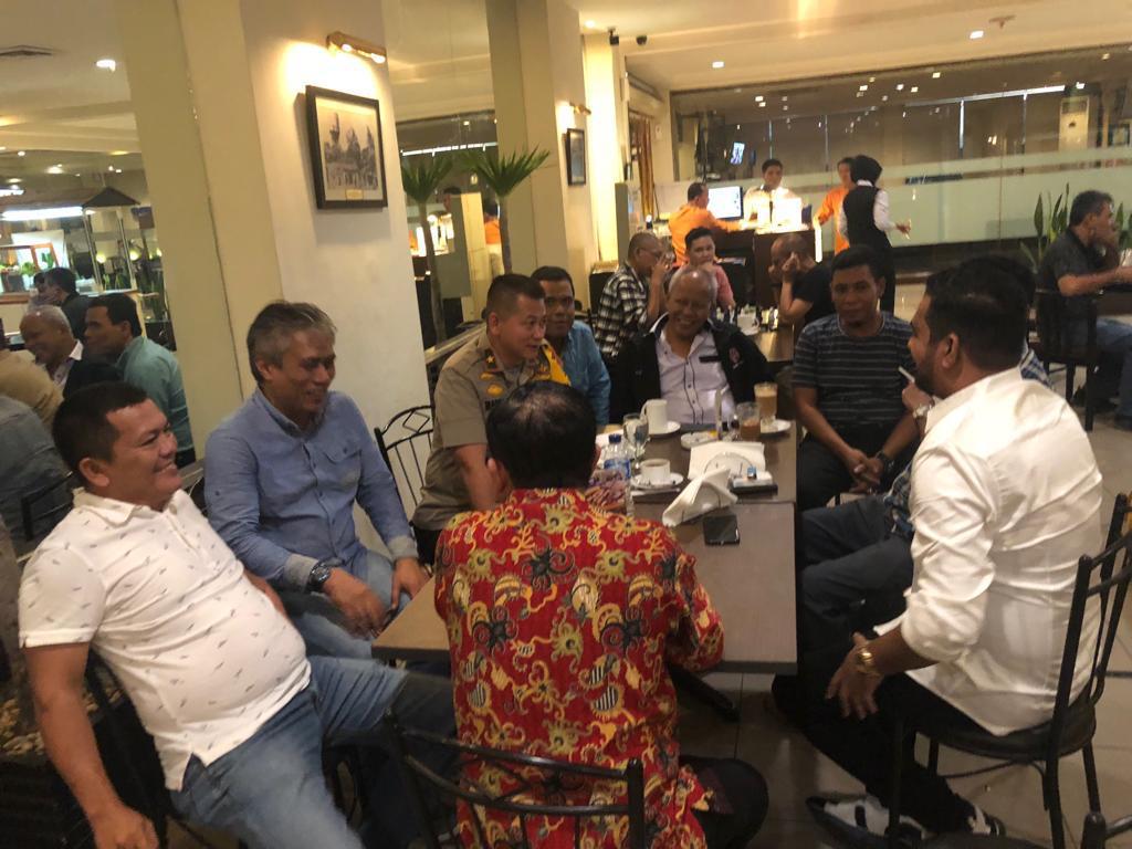 Tampak Ketua AMPG Sumut Dedek, Joharis Lubus, Khairul Saleh Nasution, para tokoh pemuda lainnya, berbincang bersama dengan Mardiaz sambil menikmati Kopi Pekantan.