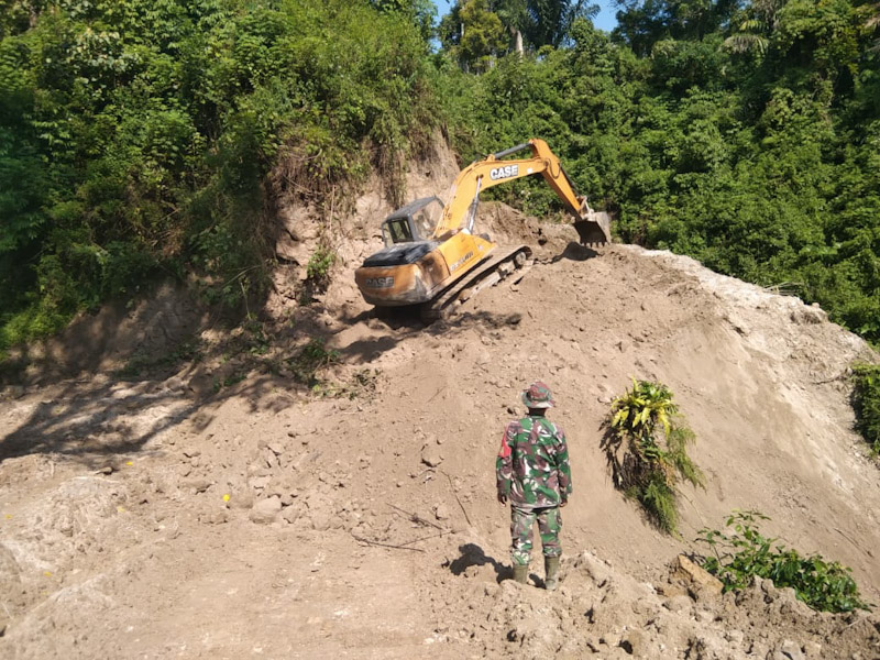 Meskipun terkendala cuaca kadang hujan dan dingginnya suhu cuaca di lokasi TMMD,personel Satgas dibantu alat berat Beko dan Excavator tetap menggasak terus pembukaan jalan untuk digunakan warga masyarakat tersebut.