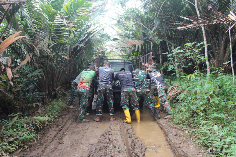 Tepat di lokasi mobil warga terperosok, dengan sigap satgas TMMD ke117 Letda Inf. Arief Sharon Naibaho tampak membantu mobil warga dijalan yang baru di buka.