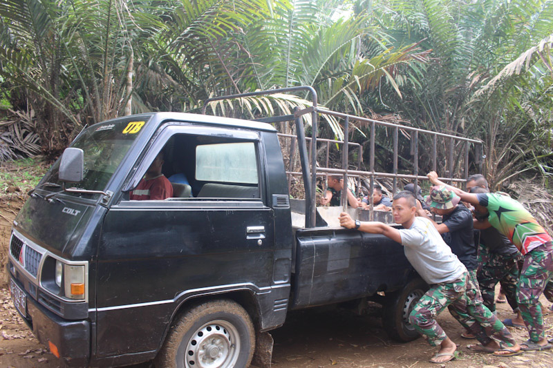 Terpantau mobil Mitsubishi L300 Pick Up milik warga Sitaratoit terperosok di jalan bukaan TMMD ke117,Satgas dengan Sigap bantu warga yang membutuhkan pertolongan.