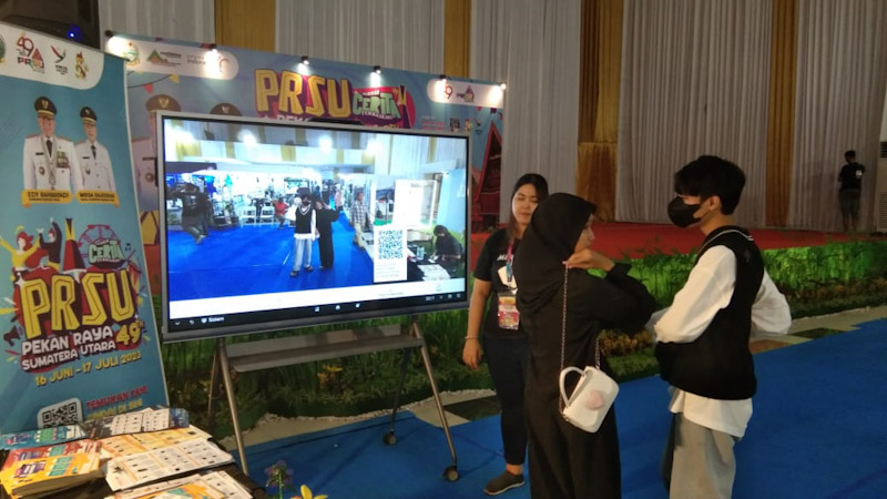 EKSISNEWS.COM, Medan – Fasilitas monitor cam yang terpampang di depan stand milik Dinas Komunikasi dan Informatika (Kominfo) Sumatera Utara (Sumut) memikat setiap pengunjung yang melintas dan masuk ke arena Pekan Raya Sumatera Utara (PRSU) Jalan Gatot Subroto Medan.
