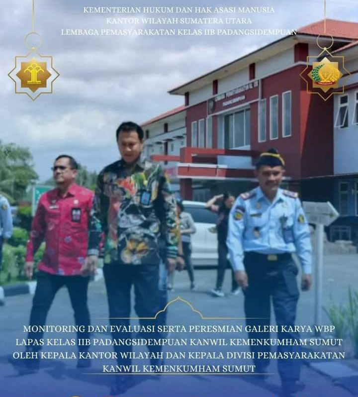 EKSISNEWS.COM, Padang Sidempuan – Kepala Kantor Wilayah Kementerian Hukum dan Hak Asasi Manusia Sumatera Utara, Imam Suyudi didampingi Kepala Divisi Pemasyarakatan Rudy F. Sianturi melakukan kunjungan kerja sekaligus Monitoring dan Evaluasi ke Lembaga Pemasyarakatan Kelas IIB Padang Sidempuan, Jumat (14/4/2023).