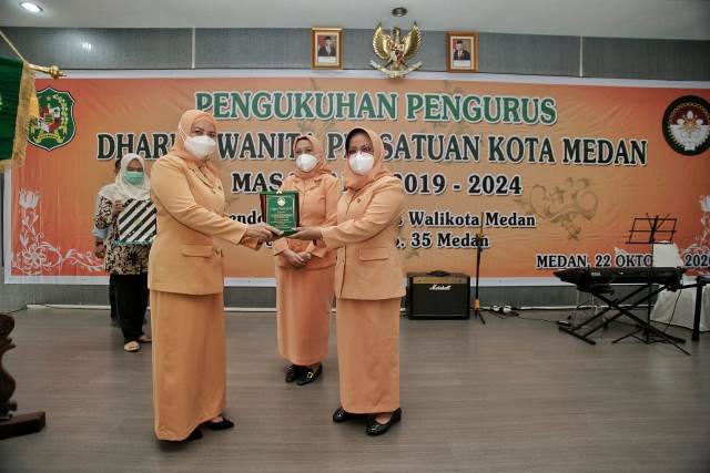 EKSISNEWS.COM, Medan – Ny Ismiralda Wiriya Alrahman resmi dikukuhkan menjadi Ketua Dharma Wanita Persatuan (DWP) Kota Medan Masa Bakti 2019 -2024 di Pendopo Rumah Dinas Wali Kota Medan Jalan Jenderal Sudirman No 35 Kelurahan Jati Kecamatan Medan Maimun, Kamis (22/10/2020). Disaksikan Pjs Penasihat DWP Kota Medan Ny Dian Rumondang Arief Sudarto Trinugroho, para pengurus DWP Kota Medan dikukuhkan oleh Ketua DWP Sumut Linda Fauziah Haris Lubis.