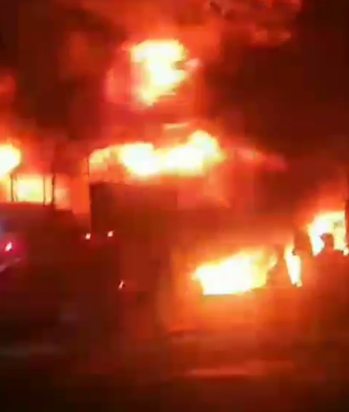 Para petugas pemadam kebakaran terlihat masih berusaha keras untuk memadamkan api yang sangat besar