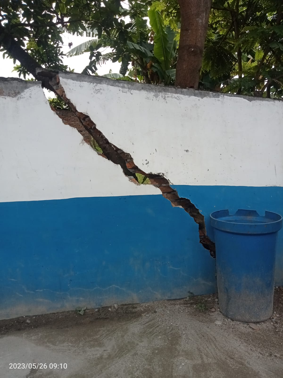 Pantauan Eksisnews.com di lokasi, Jumat (26/5/2023), terlihat beberapa meter pagar tembok sekolah porak poranda dan di bagian sisi lain tembok tersebut bangunannya terlihat retak patah serta sangat mengancam keselamatan para siswa.