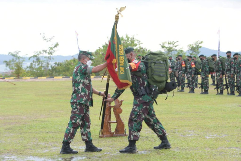 EKSISNEWS.COM, Batam – Pangdam I/BB Mayjen TNI Achmad Daniel Chardin, SE, MSi, memimpin upacara pengantaran Satgas Yonif Raider Khusus 136/TS selaku Satgas satuan organik Papua Barat yang akan melaksanakan tugas perbantuan teritorial di Kodim dan Koramil melalui kegiatan Binter dan Komsos wilayah Kodam XVIII/Kasuari, provinsi Papua Barat TA. 2022, upacara dilaksanakan di Mako Yonif Raider Khusus 136/TS Jl. Trans Barelang KM 5 Tembesi, Segalung Batam, Kepri, Kamis (10/3/2022).
