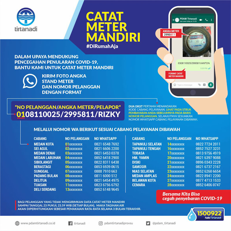 “Caranya sangat mudah, pelanggan cukup mengirimkan foto angka stand meter dan nomor pelanggan, dengan menandakan angka dua digit di awal pada no pelanggan contohnya : ketik no pelanggan (0108110025) kemudian angka meter (2995811) dan nama pelanggan (RIZKY) selanjutnya kirim ke no WhatsApp (WA) sesuai kantor cabang pelayanan,” kata Kepala Divisi (Kadiv) Sekretaris Perusahaan (Sekper) PDAM Tirtanadi Sumut Humarkar Ritonga melalui telepon selularnya Sabtu (18/4/2020).