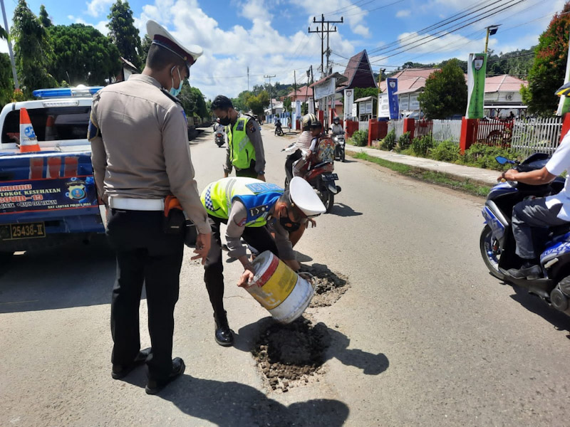 Peduli Keselamatan Pengguna Jalan Sat Lantas Polres Nias menambal Jalan Berlobang