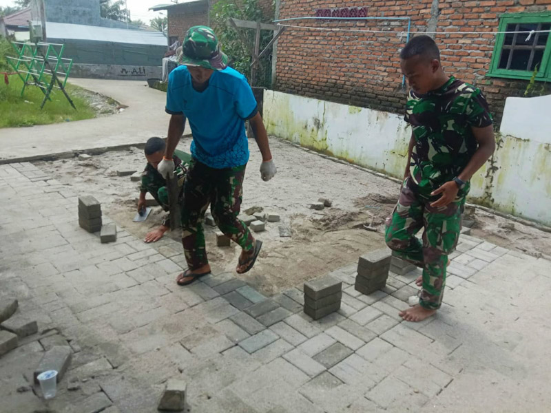 Personil Satgas TNI Manunggal Membangun Desa (TMMD) ke-118 Kodim 0201/Medan melakukan pemasangan paving block di halaman Musholla Al-Muttaqin, Kelurahan Paya Pasir, Kecamatan Medan Marelan. Jumat (12/10/2023).
