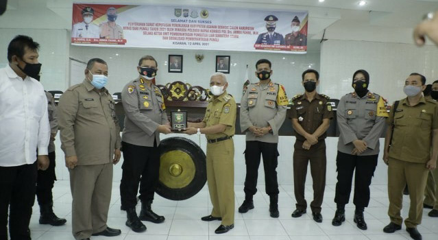 EKSISNEWS.COM, Kisaran – Bupati Asahan H. Surya Bsc menerima Surat Keputusan (SK) Penunjukan Kabupaten Asahan Sebagai Calon Kabupaten Bebas Dari Pungli Tahun 2021, dimana SK tersebut diserahkan Irwasda Poldasu Kombes Pol Drs. Armia Fahmi, M.H selaku Ketua Unit Pemberantasan Pungutan Liar Sumatera Utara dan sekaligus menggelar Sosialisasi Pemberantasan Pungli, yang berlangsung di Aula Melati Kantor Bupati Asahan, Senin (12/04/2021).