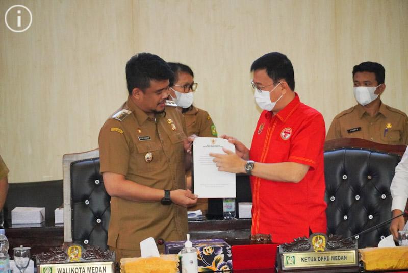 Usai menyampaikan sambutannya, Bobby Nasution selanjutnya menyerahkan Nota Pengantar Terhadap Ranperda Kota Medan tentang Penyelenggaraan Perlindungan Anak kepada Ketua DPRD Kota Medan Hasyim SE. Sebelumnya, rapat paripurna dibuka Ketua DPRD dan dihadiri Wakil Ketua DPRD, anggota dewan, pimpinan OPD dan Camat. (ENC-1)