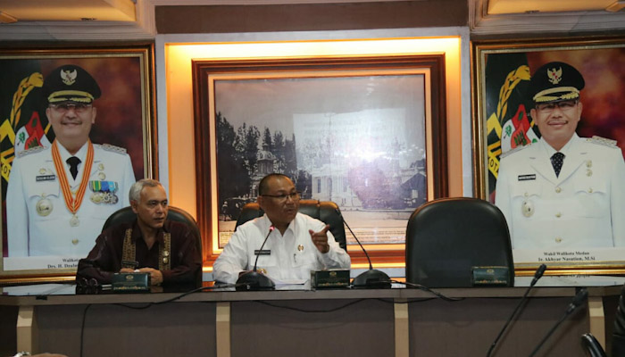MEDAN, Eksisnews.com – Sebagai upaya mengatasi genangan air maupun banjir di sejumlah kecamatan di Kota Medan, Pemko Medan menggelar Rapat Koordinasi Pembahasan Konektivitas Drainase Yang Berhubungan Dengan Jalan & Lintasan Rel Kereta Api (KA) di Balai Kota Medan, Kamis (17/10). Pasalnya, sejumlah drainase yang terkoneksi langsung dengan jalan maupun lintasan kereta api ditengarai sebagai pemicu terjadinya genangan air maupun banjir.